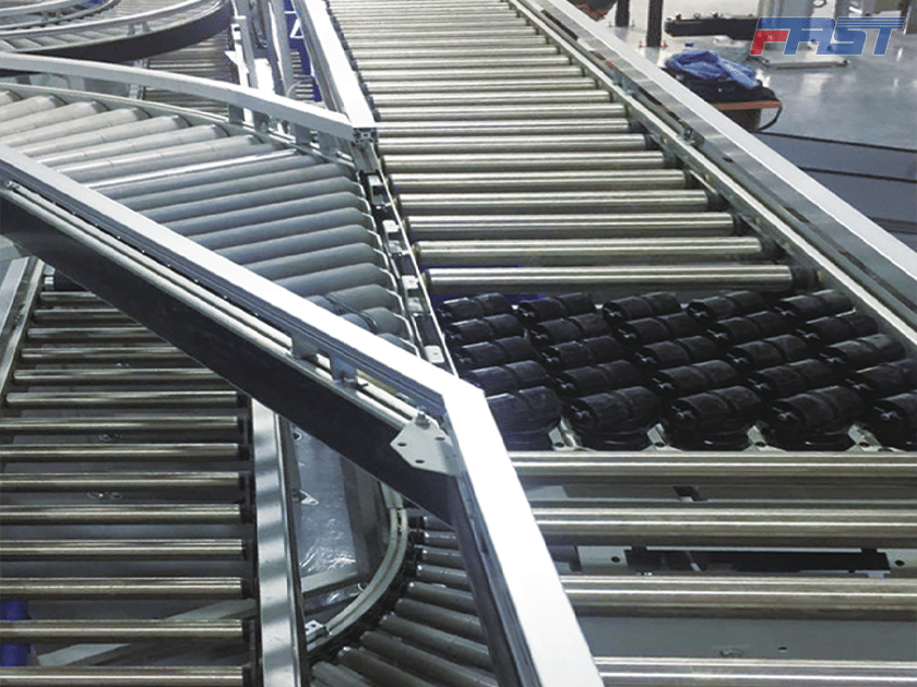 轉(zhuǎn)動著的斜導(dǎo)輪,在平行排列的主窄幅皮帶間隙中浮上、下降時,達(dá)到商品的分流目的最大分揀效率: 3000件/小時